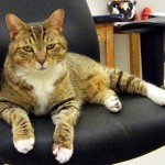 His name’s Spanky, maybe in honor of his spankin’ clean white paws — but then his pure white bib and mouth are equally immaculate, so who knows. He’s in his prime, we figure he was 7 on his last birthday; he’s already neutered, healthy and well cared for, imminently social and quick to come when you call him. Spanky’s clearly someone’s dear lost pet, and he’s the perfect candidate for “All-Time Best Outdoor Cat.” He loves to be outside, happily guarding your doorstep and soaking up the rays, comforting and comfortable, just close enough to rub his kind affection on you at every opportunity. Spanky’s fine with other cats and dogs, and would be a fun, steadfast friend for your kids — and you too, of course, and probably and your neighbors. Take him home and let him work his quiet love magic on you and yours.