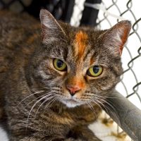 Four-year-old Liza is a gorgeous, eye-catching full-figured gal. She wears a stunning brown and orange coat and impeccable eye makeup. She’s generally laid back choosing to nap away the hours. But when it’s feeding time — be ready. No food bowl can be filled fast enough for this cat. She’ll come alive with the energy she’s saved while sleeping and make a fast and furious bolt for the food bowl. Besides food, she very much enjoys conversations with people and their affection.