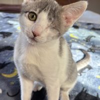 BooBoo is a 3-month-old kitten who is truly special. When he arrived at the shelter, he had a severe eye infection, and the decision was made to remove his affected eye. Thanks to the wonderful care of his foster mom, he has healed up beautifully. BooBoo is now living his best life—nothing slows him down. He is all kitten and ready to take on the wide world.