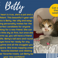 Her heart is true, she’s a pal and a confidant. This beautiful 1-year-old calico is Betty. Her silly and easy-going personality makes her the perfect candidate for anyone looking for a new friend. She can be a little shy at first, but once she warms up, you will have a friend for life. Betty’s tall ears and round eyes have her ready for any storytime and all the snuggles you can spare. She loves napping under her favorite blanket and nibbling on her favorite treats. Let Betty be your new confidant!