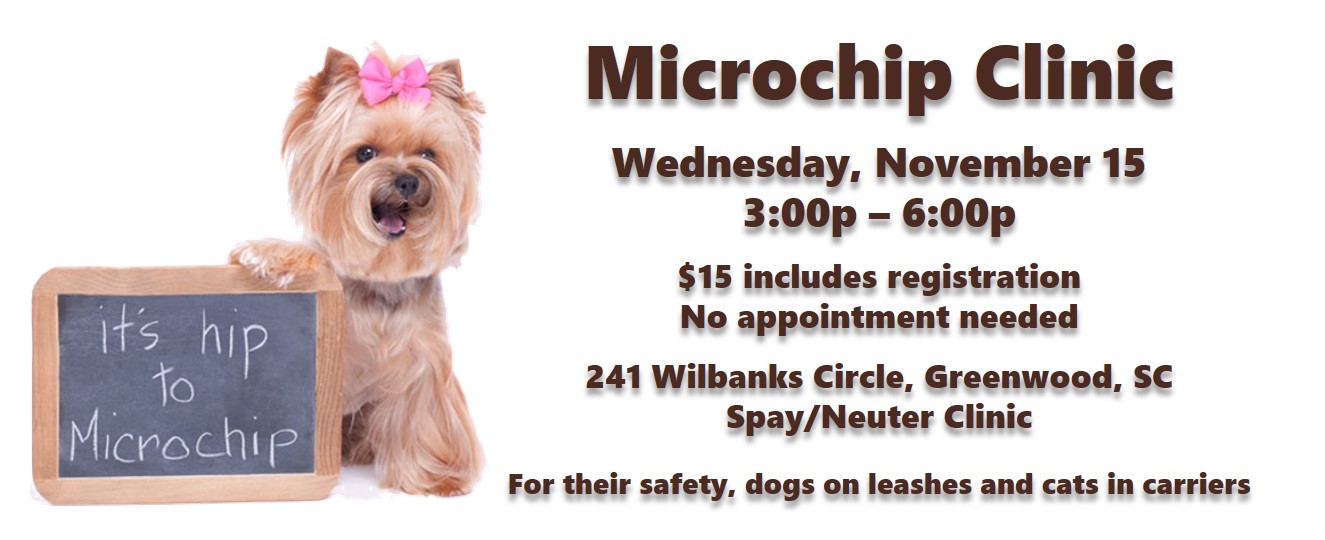 The Humane Society of Greenwood is offering a microchip clinic to the public. Cost is $15, includes registration with 24PetWatch.