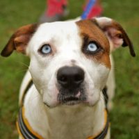 The name “Ice” might reflect her frosty blue eyes, but her sweet personality will melt your heart. This pretty little girl loves nothing more than to run laps around the yard, take long walks, and play with doggy toys. Ice is a beautiful 18-month-old Hound mix with a snowy white coat adorned with light brown across her ears and left eye. Pair that with her clear blue gaze, and you have a winning combination. She is never short of energy, so she’ll want a large fenced-in yard. And although she loves meeting new people, she’s not very fond of cats, so she’s looking for a home without kitty siblings.